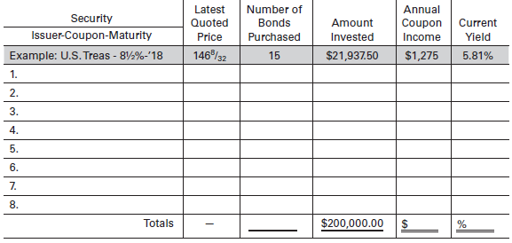 c. Using a recent issue of the Wall Street Journal, Barronâs, or an online source, construct a $200,000 bond portfolio for the Shuman family. Use real securities and select any bonds (or notes) you like, given the following ground rules: