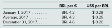 > McCarthy, Inc.’s Brazilian subsidiary borrowed 100,000 euros on January 1, 2017. Exchange rates between the Brazilian real (BRL) and euro (€) and between the U.S. dollar ($) and BRL are as follows: What amo