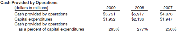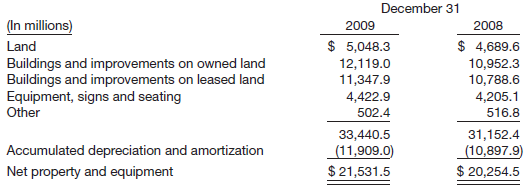 December 31 (In millions) 2009 2008 $ 5,048.3 12,119.0 11,347.9 $ 4,689.6 10,952.3 10,788.6 4,205.1 516.8 Land Buildings and improvements on owned land Buildings and improvements on leased land Equipment, signs and seating Other 4,422.9 502.4 33,440.5 (11,909.0) $ 21,531.5 31,152.4 _(10,897.9) $ 20,254.5 Accumulated depreciation and amortization Net property and equipment Cash Provided by Operations (dollars in millions) 2009 2008 2007 $5,751 $1,952 $5,917 $2,136 $4,876 $1,947 Cash provided by operations Capital expenditures Cash provided by operations as a percent of capital expenditures 295% 277% 250%