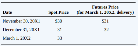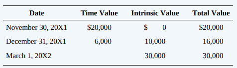 Futures Price Date Spot Price (for March 1, 20X2, delivery) November 30, 20X1 $30 $31 December 31, 20x1 31 32 March 1, 20X2 33 Date Time Value Intrinsic Value Total Value November 30, 20X1 $20,000 $ 0 $20,000 December 31, 20X1 6,000 10,000 16,000 March 1, 20X2 30,000 30,000