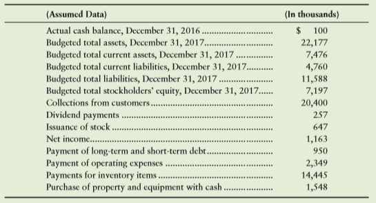 (Assumed Data) (In thousands) Actual cash balance, December 31, 2016 . Budgeted total assets, December 31, 2017. Budgeted total current assets, December 31, 2017 . Budgeted total current liabilities, December 31, 2017. Budgeted total liabilities, December 31, 2017 . Budgeted total stockholders' equity, December 31, 2017.. Collections from customers.. Dividend payments Issuance of stock. $ 100 22,177 7,476 4,760 ...... 11,588 7,197 20,400 257 647 Net income.. 1,163 Payment of long-term and short-term debt. Payment of operating expenses Payments for inventory items . Purchase of property and equipment with cash. 950 ..................... 2,349 14,445 1,548