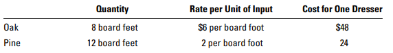 Quantity Rate per Unit of Input Cost for One Dresser Oak 8 board feet $6 per board foot $48 Pine 12 board feet 2 per board foot 24
