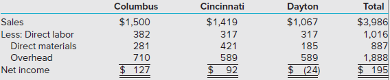 Miami Valley Architects Inc. provides a wide range of engineering and architectural consulting services through its three branch offices in Columbus, Cincinnati, and Dayton, Ohio. The company allocates resources and bonuses to the three branches based on the net income of the period. The results of the firmâs performance for the most recent year follows ($ in thousands):