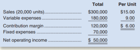 Total Per Unit Sales (20,000 units).. Variable expenses. $300,000 $15.00 180,000 9.00 Contribution margin . Fixed expenses 120,000 $ 6.00 70,000 Net operating income . $ 50,000