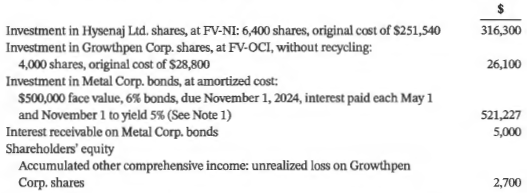 2. Minute Corp. uses the FV-NI method for investments acquired for trading purposes, and the FV-OCI method for investments that it intends to hold for their growth potential. For the FV-OCI investments, transaction costs are capitalized, and when gains and losses are realized on equity investments, they are reclassified to Retained Earnings. Interest and dividends are not reported separately from other investment income for investments held for trading and are accounted for at FV-Nl.