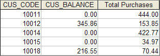 CUS CODE CUS BALANCE Total Purchases 444.00 153.85 10011 0.00 10012 345.86 10014 0.00 422.77 10015 0.00 34.97 10018 216.55 70.44