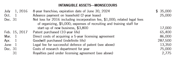Intangible Assets–MONSECOURS July 1, 2016 1 Oct. $ 35,000 25,000 8-year franchise; expiration date of June 30, 2024 Advance payment on leasehold (2-year lease) Net loss for 2016 including incorporation fee, $1,000; related legal fees of organizing, $5,000; expenses of recruiting and training staff for start-up of new business, $3,800 Dec. 31 17,000 65,400 86,000 287,500 13,350 75,000 2,775 Feb. 15, 2017 Patent purchased (10-year life) Mar. 1 Аpr. June 1 Dec. 31 31 Direct costs of acquiring a 5-year licensing agreement Goodwill purchased (indefinite life) Legal fee for successful defence of patent (see above) Costs of research department for year Royalties paid under licensing agreement (see above)