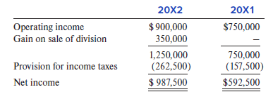 On January 1, 20X2, Munnster Corporation agreed to sell the assets and product line of one of its operating divisions for $2,000,000. The sale was consummated on December 31, 20X2, and it resulted in a pre-tax gain on disposition of $350,000. This divisionâs pre-tax net losses were $505,000 in 20X2 and $170,000 in 20X1. The income tax rate for both years was 21%.