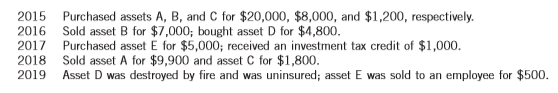 2015 Purchased assets A, B, and C for $20,000, $8,000, and $1,200, respectively. 2016 2017 2018 2019 Sold asset B for $7,000; bought asset D for $4,800. Purchased asset E for $5,000; received an investment tax credit of $1,000. Sold asset A for $9,900 and asset C for $1,800. asset D was destroyed by fire and was uninsured; asset E was sold to an employee for $500.