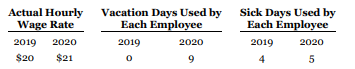 Actual Hourly Wage Rate Vacation Days Used by Each Employee Sick Days Used by Each Employee 2019 2020 2019 2020 2019 2020 $20 $21 9 4 5