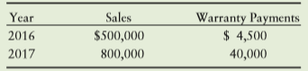 Warranty Payments $ 4,500 Year Sales 2016 $500,000 2017 800,000 40,000