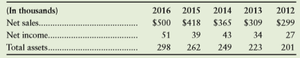 (In thousands) 2016 2015 2014 2013 2012 Net sales.. $500 $418 $365 $309 $299 ........ Net income.. 51 39 43 34 27 ......... Total assets.. 298 262 249 223 201 .........