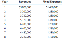 Year Revenues Fixed Expenses 1 $3,000,000 $1,480,000 2 3,200,000 1,280,000 3 3,720,000 1,280,000 4 5,120,000 1,440,000 5 6,400,000 1,280,000 6. 6,400,000 1,280,000 7 4,480,000 1,280,000 2,720,000 1,120,000