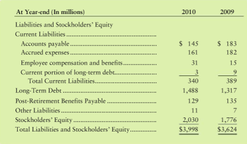 At Year-end (In millions) 2009 2010 Liabilities and Stockholders’ Equity Current Liabilitie . $ 145 $ 183 Accounts payable. Accrued expenses . 161 182 Employee compensation and benefits. Current portion of long-term debt.. Total Current Liabilities.. 31 15 3 9 340 389 Long-Term Debt . Post-Retirement Benefits Payable . 1,488 1,317 129 135 Other Liabilities . Stockholders’ Equity. Total Liabilities and Stockholders’ Equity. 11 2,030 $3,998 1,776 $3,624