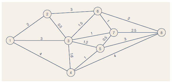 North Yorkshire University is installing a secure electronic mail system. The following network shows the possible electronic connections among the offices. Distances between offices are shown in km. Develop a design for the office communication system that will enable all offices to have access to the electronic mail service. Provide the design that minimizes the total length of connection among the eight offices.