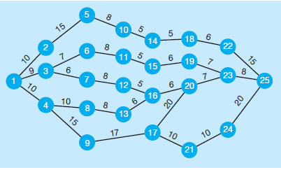 Northwest University is in the process of completing a computer bus network that will connect computer facilities throughout the university. The prime objective is to string a main cable from one end of the campus to the other (nodes 1â25) through underground conduits. These conduits are shown in the network below; the distance between them is in hundreds of feet. Fortunately, these underground conduits have remaining capacity through which the bus cable can be placed.