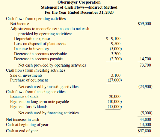 Obermeyer Corporation Statement of Cash FlowsIndirect Method For the Year Ended December 31, 2020 Cash flows from operating activities Net income $59,000 Adjustments to reconcile net income to net cash provided by operating activities: Depreciation expense Loss on disposal of plant assets Increase in inventory $ 9,100 9,500 (5,000) 3,300 (2,200) Decrease in accounts receivable Decrease in accounts payable 14,700 Net cash provided by operating activities 73,700 Cash flows from investing activities Sale of investments 3,100 (27,000) Purchase of equipment Net cash used by investing activities (23,900) Cash flows from financing activities Issuance of stock Payment on long-term note payable Payment for dividends 20,000 (10,000) (15,000) Net cash used by financing activities (5,000) Net increase in cash 44,800 Cash at beginning of year 13,000 Cash at end of year $57,800