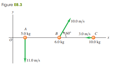 Figure E8.3 10.0 m/s A 5.0 kg B60° В 3.0 m/s C 6.0 kg 10.0 kg V11.0 m/s