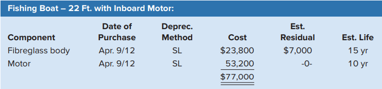 Ocean Fishers Ltd. had a 22-foot fishing boat with an inboard motor that was purchased on April 9, 2012, for $77,000. The PPE subledger shows the following information regarding the boat: