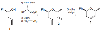 1) Nal 1, then Ph. HO- Ph, co,Et Grubbs catalyst Ph , 2) DIBAH 3) Ph,P =CH, 3 2 1