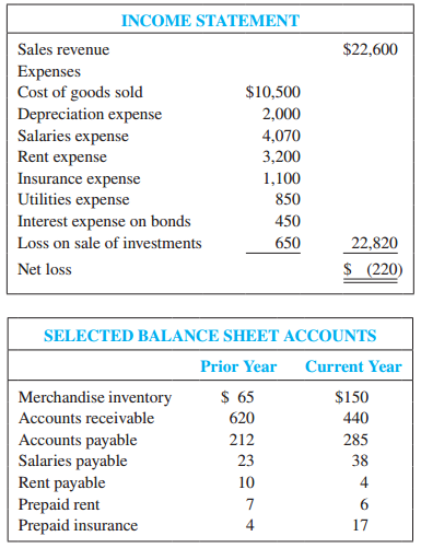 Income Statement Sales revenue $22,600 Expenses Cost of goods sold Depreciation expense Salaries expense Rent expense Insurance expense Utilities expense $10,500 2,000 4,070 3,200 1,100 850 Interest expense on bonds 450 Loss on sale of investments 650 22,820 Net loss $ (220) SELECTED BALANCE SHEET ACCOUNTS Prior Year Current Year $ 65 620 Merchandise inventory $150 Accounts receivable 440 Accounts payable Salaries payable Rent payable Prepaid rent Prepaid insurance 212 285 23 38 10 4 7 6 4 17