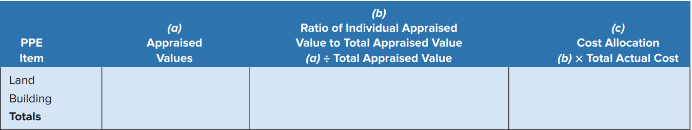 On April 14, 2020, Orchid Company, a new Thai restaurant, purchased land and a building for a total price of $540,000, paying cash of $85,000 and borrowing the balance from the bank. The bank appraised the land at $320,000 and the building at $180,000. Complete the following table and prepare the entry to record the purchase.