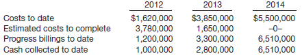 2012 2013 2014 $1,620,000 3,780,000 1,200,000 1,000,000 $3,850,000 1,650,000 3,300,000 2,800,000 Costs to date $5,500,000 Estimated costs to complete Progress billings to date -0- 6,510,000 6,510,000 Cash collected to date