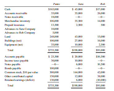 Punto Sara Rob $165,000 $ 45,000 Cash $17,000 Accounts receivable 35000 35,000 26000 Notes recivable 18000 Merchandise inventory 106000 35,500 14000 Prepaid insurance 13,500 2,500 500 Advances to Sara Company 10000 Advances to Rob Company 5000 Land 248000 43,000 15,000 Buildings (net) 100,000 27,000 16,000 Equipment (net) 35000 10,000 2,500 Total $735,500 $198,000 $91,000 $ 25,500 $ 20,000 Accounts payable Income taxes payabk Notes payable S10,500 30,000 10,000 6,000 10,500 Bonds payable 100p00 Common stock, $10 par valuc 300,000 144,000 42,000 Other contributed capital Retained earnings (deficit) 150,000 12,000 38,000 130p00 6,000 (10,000) Total $735,500 $198,000 $91,000