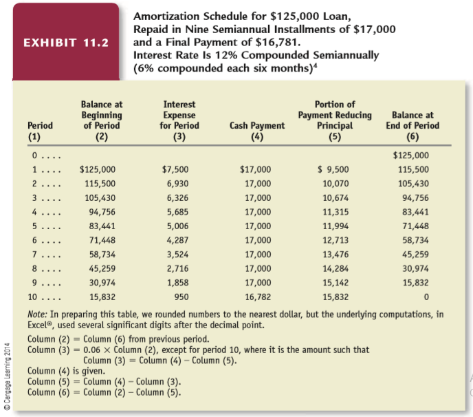Amortization Schedule for $125,000 Loan, Repaid in Nine Semiannual Installments of $17,000 and a Final Payment of $16,781. Interest Rate Is 12% Compounded Semiannually (6% compounded each six months)* EXHIBIT 11.2 Balance at Interest Еxpense for Period (3) Portion of Period (1) Beginning of Period (2) Cash Payment (4) Payment Reducing Principal (5) Balance at End of Period (6) 0... $125,000 $125,000 $7,500 $17,000 $ 9,500 115,500 1. .... 2.... 115,500 6,930 17,000 10,070 105,430 105,430 6,326 17,000 10,674 94,756 94,756 5,685 17,000 11,315 83,441 4 .... 83,441 5,006 17,000 11,994 71,448 71,448 4,287 17,000 12,713 58,734 .... 7 58,734 3,524 17,000 13,476 45,259 .... 8. 45,259 2,716 17,000 14,284 30,974 .... 9.... 30,974 1,858 17,000 15,142 15,832 10 15,832 950 16,782 15,832 ... Note: In preparing this table, we rounded numbers to the nearest dollar, but the underlying computations, in Excel®, used several significant digits after the decimal point. Column (2) = Column (6) from previous period. Column (3) = 0.06 × Column (2), except for period 10, where it is the amount such that Column (3) = Column (4) – Column (5). Column (4) is given. Column (5) = Column (4) – Column (3). Column (6) = Column (2) – Column (5). © Cengage Learning 2014