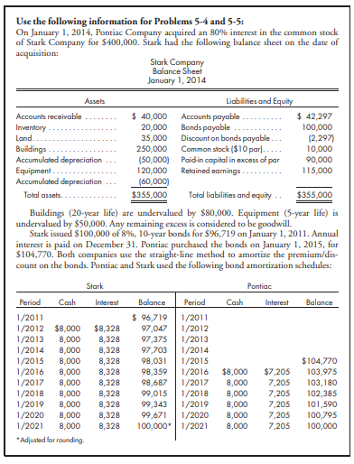 General Appliance Outlets Appliances Cash 404,486 752,500 9,625 1,950,000 1,700,000 254,000 175,000 9,000,000 72,625 105,000 Accounts Receivable (net) Interest Receivable. Inventory . Investment in Appliance Outlets Investment in 11% Bonds.. 900,000 Investment in Mortgage.. Property, Plant, and Equipment.. Accumulated Depreciation Accounts Payable Interest Payable .. Bonds Payable (11%) . Discount on Bonds Payable. Mortgage Payable... Common Stock ($5 par) Common Stock ($10 par) Paid-In Capital in Excess of Par Retained Earnings, January 1, 2016. Sales . 2,950,000 (1,695,000) (670,000) (18,333) (2,000,000) 10,470 (940,000) (80,000) (9,625) (500,000) 12,000 (175,000) (3,200,000) (800,000) (625,000) (770,000) (3,000,000) (4,550,000) (1,011,123) (9,800,000) (27,500) (36, 125) (48,000) 4,940,000 717,000 223,000 2,600,000 320,000 Gain on Sale of Building Interest Income.. Dividend Income Cost of Goods Sold Depreciation Expense Interest Expense.. Other Expenses.. 1,700,000 95,950 67,544 936,506 60,000 Dividends Declared. Totals .. Use the following information for Problems 5-4 and 5-5: On January 1, 2014, Pontiac Company acquired an 80% interest in the common stock of Stark Company for $400,000. Štark had the following balance sheet on the date of acquisition: Stark Company balance sheet January 1, 2014 Assets Liabilities and Equity $ 40,000 20,000 35,000 250,000 (50,000) Paidin capital in excess of par 120,000 $ 42,297 Accounts payable Bonds payable Discount on bonds payable Common stock ($10 par). Accounts receivable 100,000 (2,297) 10,000 90,000 115,000 Inventory. Land. Buildings Accumulated Depreciation Equipment.. Accumulated depreciation Retained earnings (60,000) Total assets. $355,000 Total liabilities and equity.. $355,000 Buildings (20-year life) are undervalued by $80,000. Equipment (5-year life) is undervalued by $50,000. Any remaining excess is considered to be goodwill. Stark issued $100,000 of 8%, 10-year bonds for $96,719 on January 1, 2011. Annual interest is paid on December 31. Pontiac purchased the bonds on January 1, 2015, for $104,770. Both companies use the straight-line method to amortize the premium/dis- count on the bonds. Pontiac and Stark used the following Bond amortization schedules: Stark Pontiac Period Cash Interest Balance Period Cash Interest Balance 1/2011 $ 96,719 97,047 97,375 97,703 98,031 98,359 98,687 99,015 99,343 1/2011 1/2012 1/2012 $8,000 8,000 8,000 8,000 8,000 8,000 8,000 8,000 8,000 8,000 $8,328 8,328 1/2013 1/2014 1/2015 1/2016 1/2017 1/2018 1/2019 1/2020 1/2021 8,328 8,328 8,328 8,328 8,328 8,328 8,328 8,328 1/2013 1/2014 1/2015 1/2016 1/2017 1/2018 1/2019 1/2020 $8,000 8,000 8,000 8,000 8,000 8,000 $7,205 7,205 7,205 7,205 7,205 7,205 $104,770 103,975 103,180 102,385 101,590 100,795 100,000 99,671 100,000* 1/2021 *Adjusted for rounding.