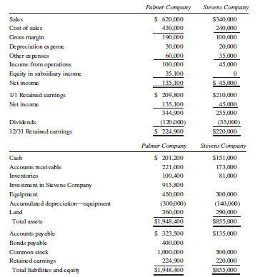 Book value Fair Value $ 90726 $ 90,726 Cash Accounts receivable 200p00 200,000 Inventories 160000 210,000 Equipment Accumulated deprociation-equipment 300p00 390,000 (100,000) (130,000) Land 190p00 290,000 Bonds payable (205,556) (150,000) Other 54,830 S690000 54,830 Total $955,556 Palmer Company Stevens Company Saks $ 620,000 $340,000 Cost of saks 430,000 240,000 Gross margin 190,000 100,000 De preciation a pene 30,000 20,000 Other apenses Income from operations 60,000 35,000 100,000 45,000 Equity in subsidiary income 35,100 $ 45,000 Net income 135,100 1/1 Retained carnings $ 209,800 $210,000 Net income 135,100 45,000 344,900 255,000 Dividends (120,000) $ 224,900 (35,000) $220,000 12/31 Retained carnings Palmer Company Stevens Company $ 201,200 Cash S151,000 Accounts reccivable 221,000 173,000 Inventories 100,400 81,000 Investment in Stevens Company 915,800 Equipment 450,000 300,000 Accumulated depreciation equipment (300,000) 360,000 (140,000) Land 290,000 Total assets $1.948,400 $ 323,500 S855,000 Accounts payable $135,000 Bonds payable 400,000 Common stock 1,000,000 S00,000 Retained carnings 224,900 220,000 Total liabilities and equity $1.948,400 S855,000