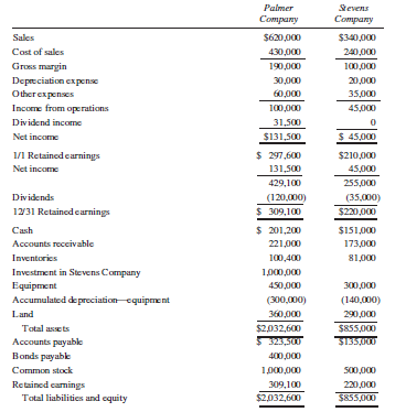 Book value Fair Value $ 0,726 $ 90,726 Cash Accounts receivable 200,000 200,000 Inventories 160 000 210,000 Equipment 300,000 390,000 Accumulated de preciation equipmnt (100,000) (130,000) Land 190,000 290,000 Bonds payabk (205,556) (150,000) Other 54,830 54,830 Total $690,000 $955,556 Palmer Stevens Соmpany Соmpany Sales $620,000 $340,000 Cost of sales 430,000 240,000 Gross margin 190,000 100,000 20,000 Depreciation expense Other ex penses Income from operations 30,000 60,000 35,000 100,000 45,000 Dividend income 31,500 $131,500 Net income $ 45,000 1/1 Retained earnings $ 297,600 $210,000 Net income 131,500 45,000 429,100 255,000 (120,000) $ 309,100 $ 201,200 Dividends (35,000) 12/31 Retained earnings $20,000 Cash $151,000 Accounts reccivable 221,000 173,000 Inventories 100,400 81,000 Investment in Stevens Company Equipment 1,000,000 450,000 300,000 Accumulated de preciation equipment (300,000) (140,000) Land 360,000 290,000 Total asets $2,032,600 $855,000 Accounts payable $ 323,500 $135,000 Bonds payabk 400,000 Common stock 1,000,000 500,000 Retained camings Total liabilities and equity 309,100 220,000 $2,032,600 $855,000
