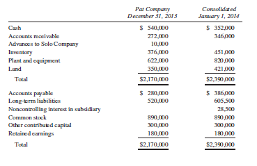Pat Company December 31, 2013 Consolida ed January 1, 2014 S 540,000 $ 352,000 346,000 Cash Accounts reccivable 272,000 Advances to Solo Company Inventory Plant and equipment 10,000 376,000 622,000 451 000 80,000 Land 350,000 421,000 Total $2,170,000 $2,390,000 S 280,000 $ 386,000 Accounts payable Long-krm liabilitics Noncontrolling interest in subsidiary Common stock 520,000 605,500 28,500 890,000 890,000 Other contributed capital Retained carnings 300,000 300,000 180,000 180,000 Total $2,170,000 $2,390 000