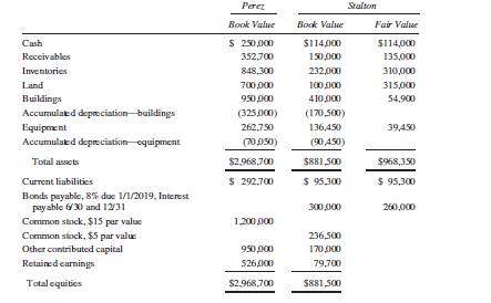 Perez Stalton Book Value Bock Value Fair Value S 250,000 352,700 Cash $114,000 $114,000 Receivables 150,000 135,000 Inventories 848,300 232,000 310,000 Land 700,000 100,000 315,000 Buildings 950 000 410,000 54,900 Accumulaed depociation buildings (325000) (170,500) Equipment 262,750 136,450 39,450 Accumulatd depeciation equipment (70,050) (90,450) Total assets S2.968,700 $881,500 $968,350 Current liabilities S 292,700 $ 95,300 $ 95,300 Bonds payable, 8% due 1/1/2019, Interest payable 630 and 1231 Common stock, $15 par value Common stock, $5 par value 300 0O0 260,000 1,200,000 236,500 Other contributed capital 950,000 170,000 Retained carnings 526,000 79,700 Total equities $2.968,700 $881,500