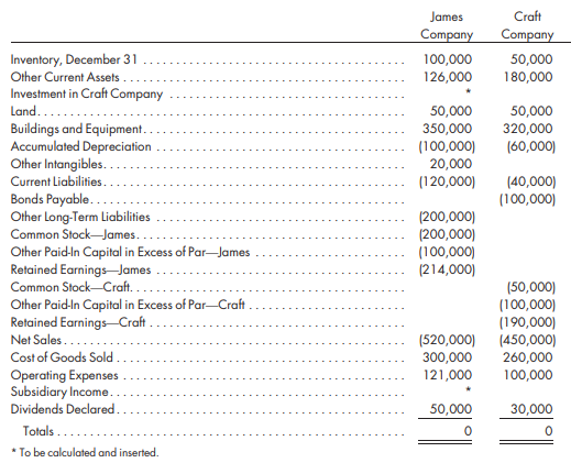 2015 2016 Net income for year.. $60,000 20,000 $90,000 30,000 Dividends, declared in December James Craft Company Company Inventory, December 31 100,000 126,000 50,000 180,000 Other Current Assets Investment in Craft Company Land..... Buildings and Equipment.. Accumulated Depreciation Other Intangibles... Current Liabilities. 50,000 350,000 50,000 320,000 (100,000) 20,000 (120,000) (60,000) (40,000) (100,000) Bonds Payable... Other Long-Term Liabilities Common Stock-James.. Other Paid-In Capital in Excess of Par-James Retained EarningsJames Common Stock-Craft. . Other Paid-In Capital in Excess of Par-Craft Retained Earnings-Craft Net Sales.... Cost of Goods Sold (200,000) (200,000) (100,000) (214,000) (50,000) (100,000) (190,000) (450,000) 260,000 100,000 (520,000) 300,000 121,000 Operating Expenses Subsidiary Income.. Dividends Declared. 50,000 30,000 Totals. * To be calculated and inserted.