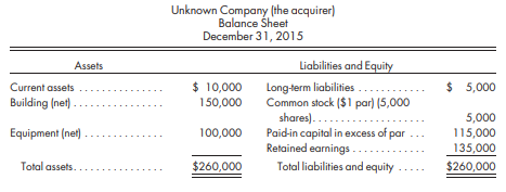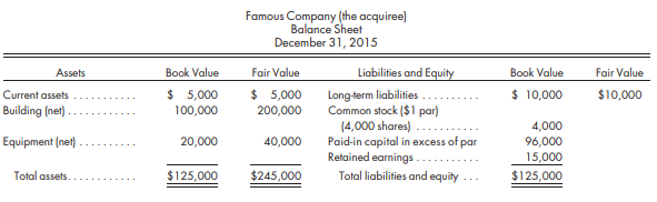 Unknown Company (the acquirer) Balance Sheet December 31, 2015 Assets Liabilities and Equity $ 10,000 150,000 $ 5,000 Long-term liabilities Common stock ($1 par) (5,000 shares)..... Paid-in capital in excess of par Retained earnings.. Current assets Building (net). 5,000 Equipment (net) 100,000 115,000 135,000 Total assets.. $260,000 Total liabilities and equity $260,000 Famous Company (the acquiree) Balance Sheet December 31, 2015 Assets Book Value Fair Value Liabilities and Equity Book Value Fair Value $ 10,000 $ 5,000 100,000 $ 5,000 200,000 Long-term liabilities Common stock ($1 par) (4,000 shares) Paid-in capital in excess of par Retained earnings .... Total liabilities and equity Current assets $10,000 Building (net) 4,000 96,000 15,000 Equipment (net) 20,000 40,000 Total assets.. $125,000 $245,000 $125,000