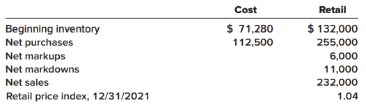 > Campbell Corporation uses the retail method to value its inventory. The following information is available for the year 2021: Required: Determine the December 31, 2021, inventory by applying the conventional retail method using the information provided.