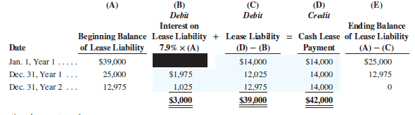 On January 1, Kwak (lessee) signs a three-year lease for equipment that is accounted for as a finance lease. The lease requires three $14,000 lease payments (the first at the beginning of the lease and the remaining two at December 31 of Year 1 and Year 2). The present value of the three annual lease payments is $39,000, using a 7.9% interest rate. The lease payment schedule follows.