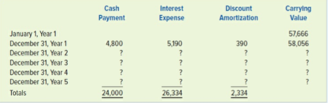 Cash Interest Discount Carrylng Value Payment Expense Amortization January 1, Year 1 December 31, Year 1 December 31, Year 2 December 31, Year 3 57,666 4,800 390 58,056 5,190 ? ? ? ? ? ? December 31, Year 4 ? ? December 31, Year 5 ? ? ? Totals 24,000 26,334 2,334
