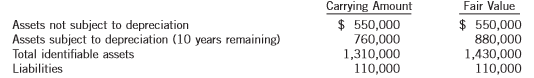 Carrying Amount $ 550,000 760,000 1,310,000 110,000 Fair Value Assets not subject to depreciation Assets subject to depreciation (10 years remaining) Total identifiable assets $ 550,000 880,000 1,430,000 110,000 Liabilities