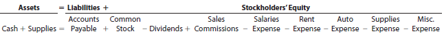Assets = Llablitles + Stockholders' Equity Sales Salaries Supplies Expense Accounts Common Rent Auto Misc. Cash + Supplies = Payable + Stock - Dividends + Commissions - Expense - Expense - Expense Expense