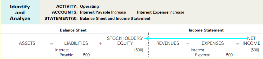 Identify and ACTIVITY: Operating ACCOUNTS: Interest Payable Increase Interest Expense Increase Analyze STATEMENT(S): Balance Sheet and Income Statement Balance Sheet Income Statement STOCKHOLDERS' EQUITY -NET INCOME ASSETS LIABILITIES REVENUES EXPENSES Interest (500) Interest (500) Payable 500 Expense 500