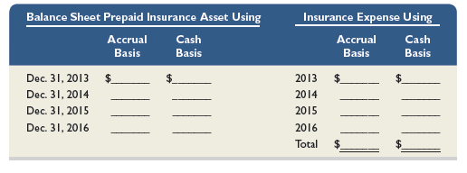 Balance Sheet Prepaid Insurance Asset Using Insurance Expense Using Accrual Cash Accrual Cash Basis Basis Basis Basis Dec. 31, 2013 $ 2013 Dec. 31, 2014 2014 Dec. 31, 2015 2015 Dec. 31, 2016 2016 Total