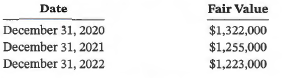 On March 1, 2020, Jessi Corp. acquired a 10-unit residential complex for $1,275,000, paid in cash. An independent appraiser determined that 75% of the total purchase price should be allocated to buildings, with the remainder allocated to land. On the date of acquisition, the building's estimated useful life was 25 years, with estimated residual value of $325,000. Jessi estimates that straight-line depreciation would best reflect the pattern of benefits it will receive from the building. Fair value of the complex, as assessed by an independent appraiser on each date, is as follows: