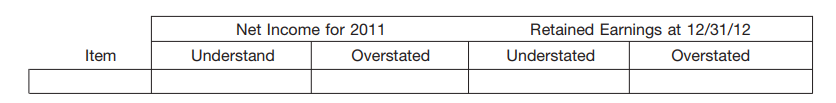 Indicate the effect of any errors on the net income figure reported on the income statement for the year ending December 31, 2011, and the retained earnings figure reported on the balance sheet at December 31, 2012. Assume all amounts are material, and ignore income tax effects. Using the following format, enter the appropriate dollar amounts in the appropriate columns. Consider each item independent of the other items. It is not necessary to total the columns on the grid.
