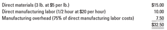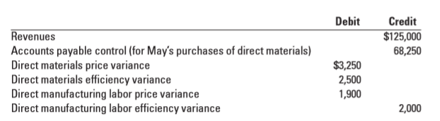Direct materials (3 lb. at $5 per Ib.) Direct manufacturing labor (1/2 hour at $20 per hour) Manufacturing overhead (75% of direct manufacturing labor costs) $15.00 10.00 7.50 $32.50 Debit Credit Revenues $125,000 Accounts payable control (for May's purchases of direct materials) Direct materials price variance Direct materials efficiency variance Direct manufacturing labor price variance Direct manufacturing labor efficiency variance 68,250 $3,250 2,500 1,900 2,000