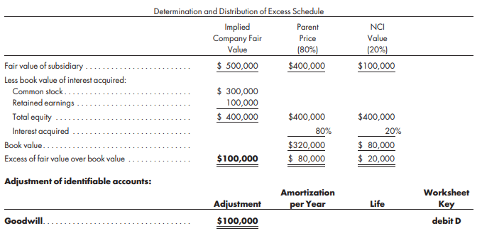 Determination and Distribution of Excess Schedule Implied Company Fair Value $ 500,000 Parent NCI Price Value (80%) (20%) Fair value of subsidiary ... Less book value of interest acquired: $400,000 $100,000 $ 300,000 100,000 $ 400,000 Common stock.. Retained earnings . Total equity $400,000 $400,000 Interest acquired 80% 20% $ 80,000 $ 20,000 book value..... $320,000 $ 80,000 Excess of fair value over book value $100,000 Adjustment of identifiable accounts: Amortization Worksheet Adjustment per Year Life Key Goodwill. $100,000 debit D Tole Marco Company Company Sales .. Less cost of goods sold. $750,000 440,000 $600,000 350,000 Gross profit .... Less other expenses.. $310,000 250,000 $250,000 140,000 Income before dividends $110,000 17,500 $110,000 Dividends received .. Income before tax $127,500 $110,000
