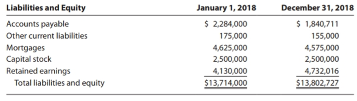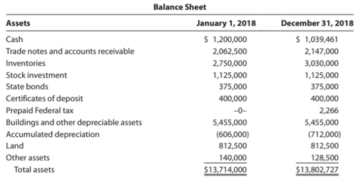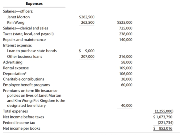 Income Statement Income $ 5,750,000 (200,000) $ 5,550,000 _(2,300,000) $ 3,250,000 Gross sales Sales returns and allowances Net sales Cost of goods sold Gross profit Dividends received from stock 43,750 investments in less-than-20%- owned U.S. corporations Interest income: State bonds $ 15,000 Certificates of deposit 20,000 35,000 $ 3,328,750 Total income Expenses Salaries-officers: Janet Morton $262,500 Kim Wong 262,500 $525,000 Salaries-clerical and sales 725,000 Taxes (state, local, and payroll) Repairs and maintenance 238,000 140,000 Interest expense: Loan to purchase state bonds $ 9,000 207,000 Other business loans 216,000 Advertising 58,000 Rental expense Depreciation* 109,000 106,000 Charitable contributions 38,000 Employee benefit programs 60,000 Premiums on term life insurance policies on lives of Janet Morton and Kim Wong; Pet Kingdom is the designated beneficiary 40,000 Total expenses (2,255,000) $ 1,073,750 (221,734) $ 852,016 Net income before taxes Federal income tax Net income per books Balance Sheet Assets January 1, 2018 December 31, 2018 Cash $ 1,200,000 $ 1,039,461 Trade notes and accounts receivable 2,062,500 2,147,000 Inventories 2,750,000 3,030,000 Stock investment 1,125,000 1,125,000 State bonds 375,000 375,000 Certificates of deposit 400,000 400,000 Prepaid Federal tax Buildings and other depreciable assets Accumulated depreciation -0- 2,266 5,455,000 5,455,000 (606,000) (712,000) Land 812,500 812,500 Other assets 140,000 $13,714,000 128,500 Total assets $13,802,727 Liabilities and Equity January 1, 2018 December 31, 2018 Accounts payable $ 2,284,000 $ 1,840,711 Other current liabilities 175,000 155,000 Mortgages Capital stock Retained earnings Total liabilities and equity 4,625,000 4,575,000 2,500,000 2,500,000 4,130,000 4,732,016 $13,802,727 $13,714,000