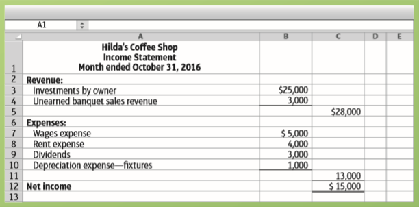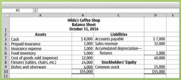 A1 Hilda's Coffee Shop Income Statement Month ended October 31, 2016 1 2 Revenue: Investments by owner 4 $25,000 3,000 3 Unearned banquet sales revenue $28,000 6 Expenses: 7 Wages expense 8 $ 5,000 4,000 3,000 1,000 Rent expense Dividends 9. 10 Depreciation expense–fixtures 11 13,000 $ 15,000 12 Net income 13 A1 Hilda's Coffee Shop Balance Sheet October 31, 2016 1 2 Assets Liabilities $ 8,000 Accounts payable 1,000 Sales revenue 1,000 Accumulated depreciation– 5,000 12,000 24,000 4,000 Common stock $55,000 $7,000 32,000 3 Cash 4 Prepaid insurance 5 Insurance expense. 6 Food Inventory 1 Cost of goods sold (expense). 8 Fixtures (tables, chairs, etc.) 9 Dishes and silverware 10 fixtures 1,000 40,000 Stockholders' Equity 15,000 $55,000 11