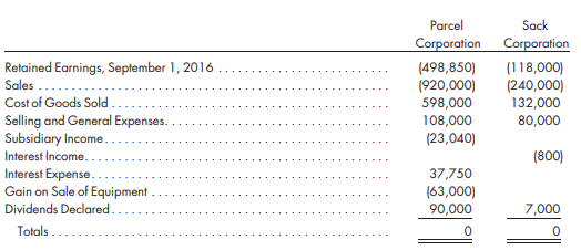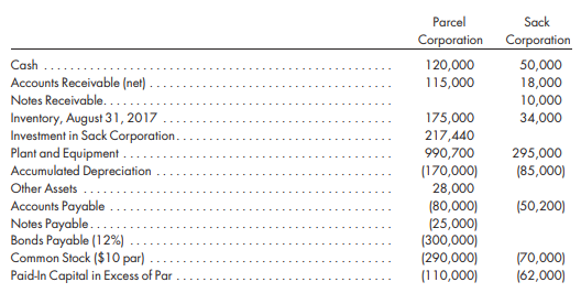 Trial balances of Parcel Corporation and Sack Corporation as of the August 31, 2017, yearend were as shown below.